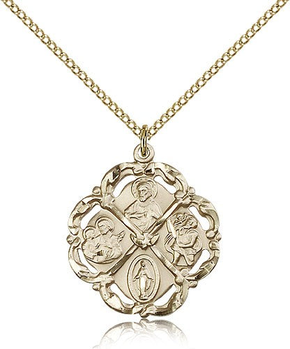 This 5 Way Cross Pendant is paired with an 18" gold filled light curb chain as pictured. All medals are gift boxed in a light blue velvet gift box ready for gift giving.