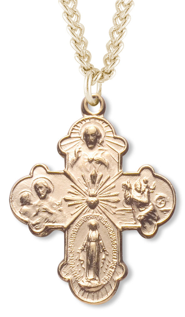 This classically designed 4 Way medal is in a cross shape with budded edges. In the center is a heart with rays of light in the background.