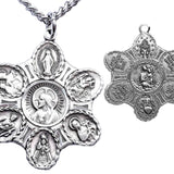 This unique 7 Way Pendant is designed with the Sacred Heart of Jesus in the center and the follow saints and holy persons the Miraculous, St. Christopher, St. Therese, Infant of Prague, St. Jude and St. Joseph.