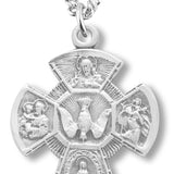A woman's pendant that combines both a cross and the classic 4-way medals including Jesus, Mary, St. Christopher, St. Joseph and the Holy Spirit in the form of a descending dove.