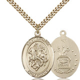 This St. George Air Force Pendant is made of gold filled and is approximately the size of a quarter. The jewelry pendant is paired with a 24 inch gold filled heavy curb chain as pictured. All medals are gift boxed in a beautiful blue velvet hinged jewelry gift box.