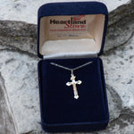 This Crucifix Pendant is paired with an 18 inch sterling silver lite curb chain as pictured.