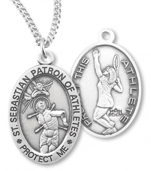She'll need strength and speed on the tennis court and a little help from Saint Sebastian will go a long way too! On the front the words "PROTECT THIS ATHLETE". On the back is a raised image of Saint Sebastian. The back of the pendant reads "Saint Sebastian Protect This Athlete".