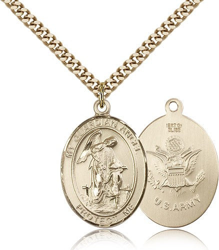 This Guardian Angel Army Pendant is made of gold filled and is approximately the size of a quarter. The jewelry pendant is paired with a 24 inch gold filled heavy curb chain as pictured. All medals are gift boxed in a beautiful blue velvet hinged jewelry gift box.