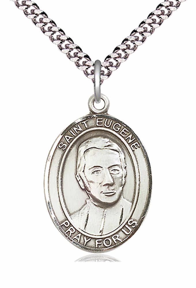 An oval shaped pendant with an image of St. Eugene De Mazenod in the center. There is a selection of chains to choose from.