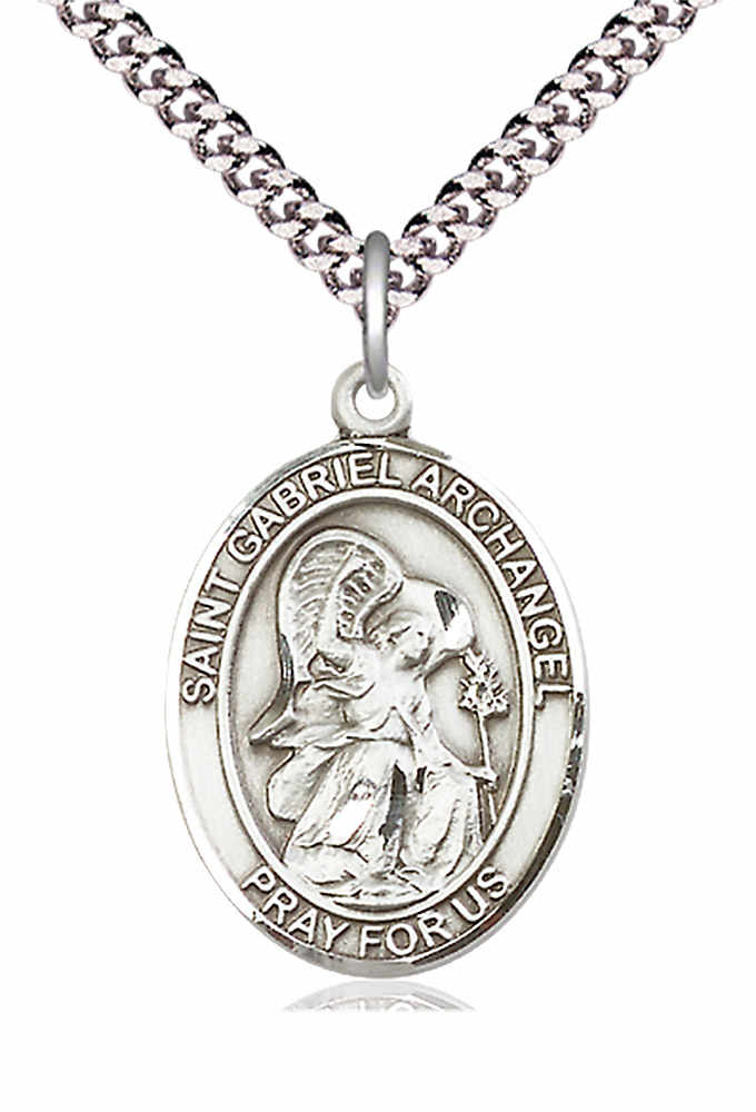 An oval shaped pendant with an image of St. Gabriel in the center. There is a selection of chains to choose from.
