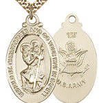 This St. Christopher Oval Army Medal is a great addition to anybody who is in the Army or would like to protect a loved one. The front of the medal depicts an image of St. Christopher with the words around the image reading "Behold St. Christopher and go your way in safety". The back of the medal depicts the U.S Army emblem.