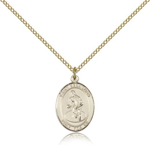 This St. Sebastian Wrestling Pendant is made of gold filled and is approximately the size of a nickel. The jewelry pendant is paired with an 18 inch gold filled light curb chain as pictured. All medals are gift boxed in a beautiful blue velvet hinged jewelry gift box.