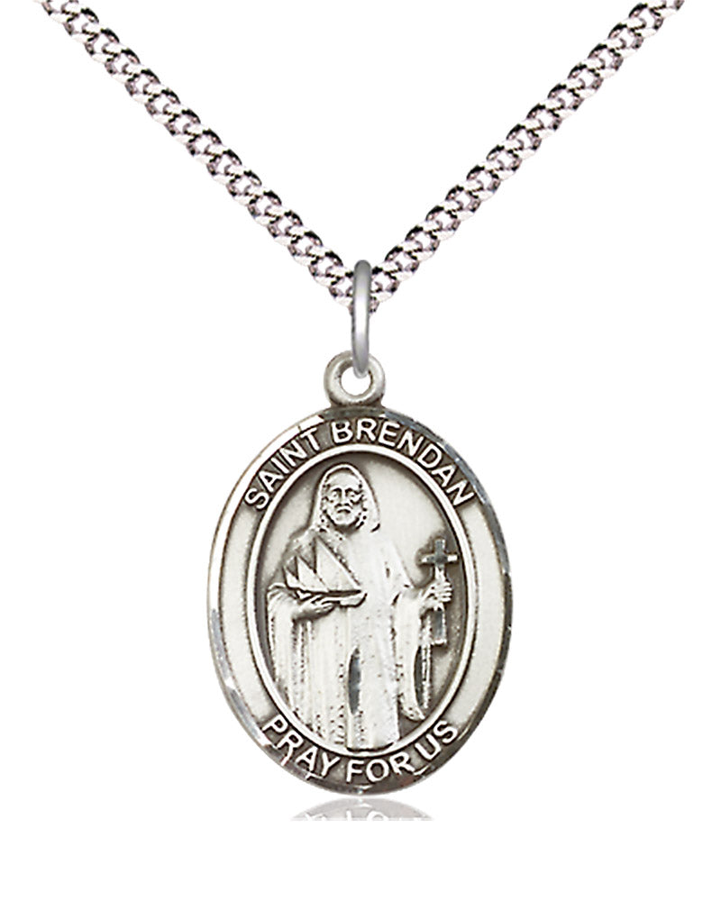 An oval shaped, dime size pendant with an image of St. Brendan the Navigator in the center. There is a selection of chains to choose from.