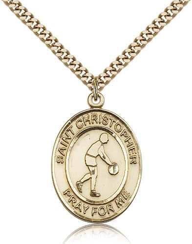 St. Christopher Basketball Medal This St. Christopher Basketball Pendant is made of gold filled and is approximately the size of a quarter. The jewelry pendant is paired with a 24 inch gold filled heavy curb chain as pictured. All medals are gift boxed in a beautiful blue velvet hinged jewelry gift box.