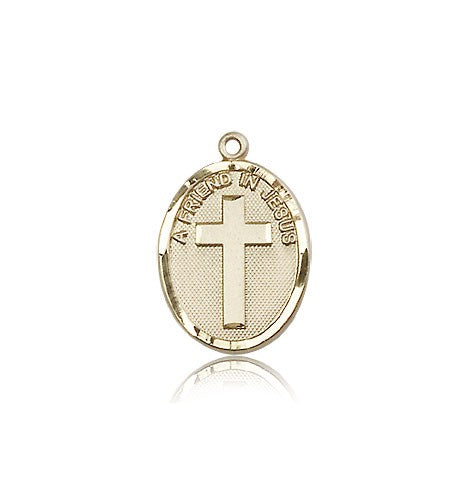 This A Friend In Jesus Medal is made of 14 Karat Gold. The jewelry pendant is sold as pictured and does not come with a chain. All medals are gift boxed in a light blue velvet jewelry box ready for gift giving.
