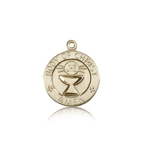 This Body of Christ Medal is made of 14 Karat Gold. The jewelry pendant is sold as pictured and does not come with a chain. All medals are gift boxed in a light blue velvet jewelry box ready for gift giving.