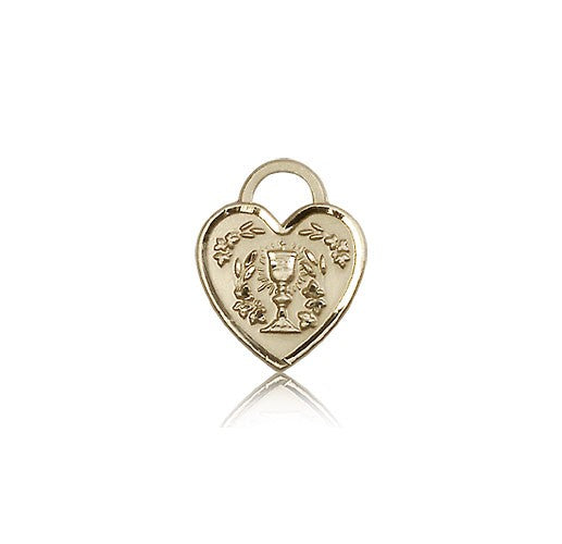 This Communion Heart Medal is made of 14 Karat Gold. The jewelry pendant is sold as pictured and does not come with a chain. All medals are gift boxed in a light blue velvet jewelry box ready for gift giving.