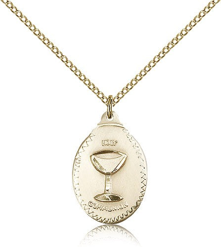 This Communion Medal is paired with an 18" gold filled light curb chain as pictured. All medals are gift boxed in a light blue velvet gift box ready for gift giving.
