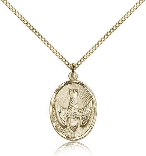 This Holy Spirit Medal is paired with an 18" gold filled light curb chain as pictured. All medals are gift boxed in a light blue velvet gift box ready for gift giving.