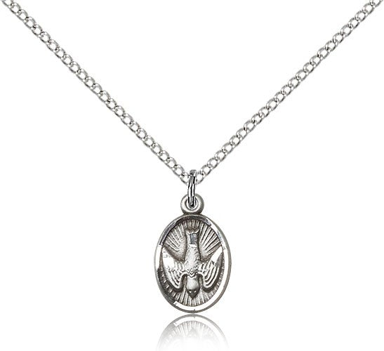 This Holy Spirit Medal is paired with an 18 inch sterling silver lite curb chain as pictured. All medals are gift boxed in a light blue velvet jewelry box ready for gift giving.