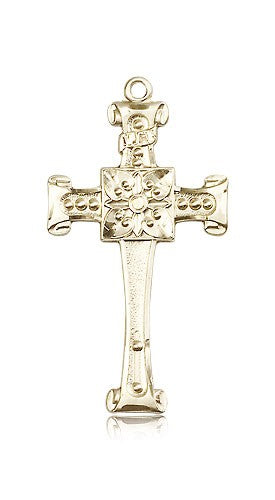 This Cross Pendant is made of 14 Karat Gold. The jewelry pendant is sold as pictured and does not come with a chain. All medals are gift boxed in a light blue velvet jewelry box ready for gift giving.