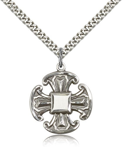 This Cross Pendant is paired with a 24 inch stainless steel heavy curb chain as pictured. All medals are gift boxed in a light blue velvet jewelry box ready for gift giving.