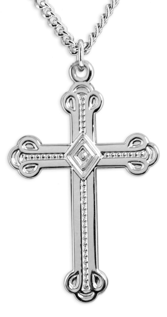 A brilliant polished Cross with beads down the center has clover leaf ends and 3 diamond shapes in the center of the Cross. Designed with a medieval styling.