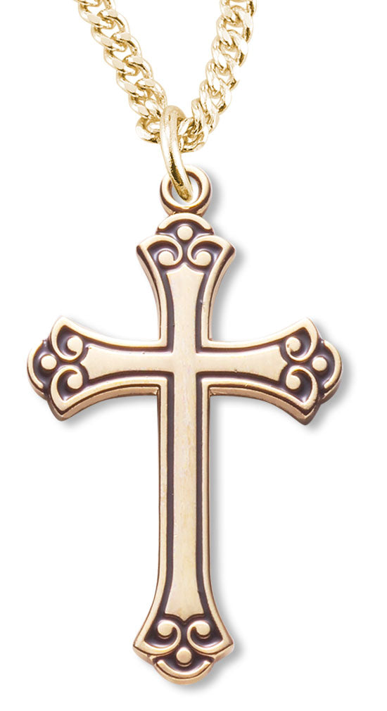 Women's 14kt Gold Plated Fleur De Lis Tip Cross Black Enamel + 18 Inch Gold Plated Chain & Clasp
