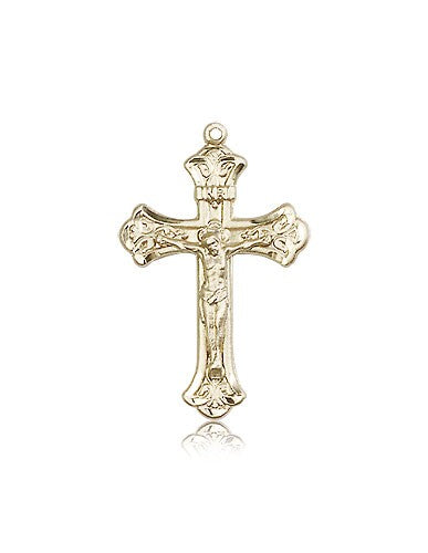 This Crucifix Pendant is made of 14 Karat Gold. The jewelry pendant is sold as pictured and does not come with a chain. All medals are gift boxed in a light blue velvet jewelry box ready for gift giving.