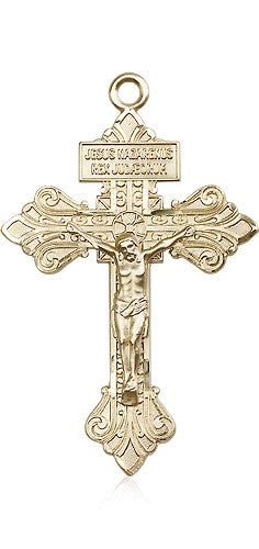 This Crucifix Pendant is made of 14 Karat Gold. The jewelry pendant is sold as pictured and does not come with a chain. All medals are gift boxed in a light blue velvet jewelry box ready for gift giving.