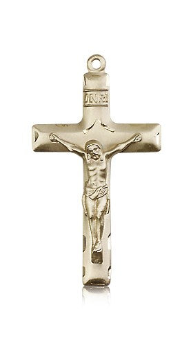 This Crucifix Pendant is made of 14 Karat Gold. The jewelry pendant is sold as pictured and does not come with a chain. All medals are gift boxed in a light blue velvet jewelry box ready for gift giving.