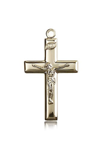 This Crucifix Pendant is made of 14 Karat Gold. The jewelry pendant is sold as pictured and does not come with a chain. All medals are gift boxed in a light blue velvet jewelry box ready for gift giving.