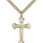 This Crucifix Pendant is paired with a 24 inch stainless steel gold-tone heavy curb chain as pictured. All medals are gift boxed in a light blue velvet jewelry box ready for gift giving.