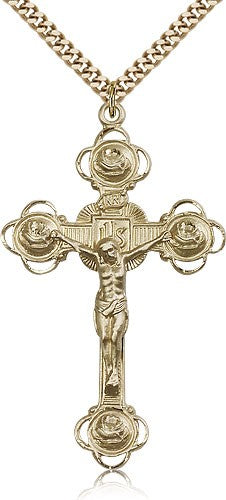 This Crucifix Pendant is paired with a 24 inch stainless steel gold-tone heavy curb chain as pictured. All medals are gift boxed in a light blue velvet jewelry box ready for gift giving.