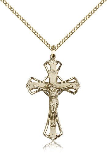 This Crucifix Pendant is paired with an 18" gold filled light curb chain as pictured. All medals are gift boxed in a light blue velvet gift box ready for gift giving.
