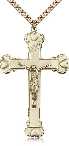 This Crucifix Pendant is paired with a 24 inch stainless steel gold-tone heavy curb chain as pictured. All medals are gift boxed in a light blue velvet jewelry box ready for gift giving.
