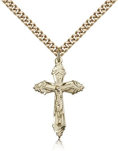 This Crucifix Pendant is paired with a 24 inch stainless steel gold-tone heavy curb chain as pictured. All medals are gift boxed in a light blue velvet jewelry box ready for gift giving.