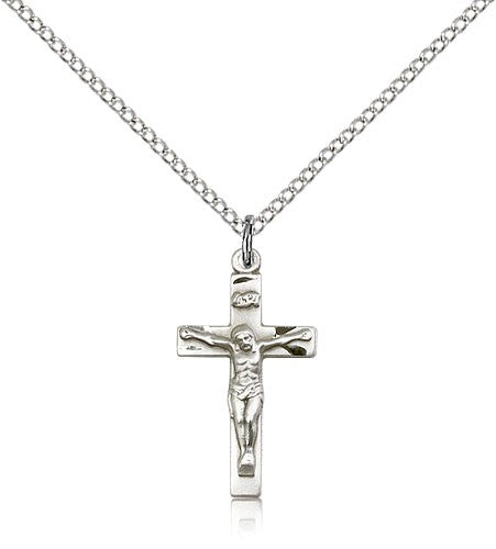 This Crucifix Pendant is paired with an 18 inch sterling silver lite curb chain as pictured. All medals are gift boxed in a light blue velvet jewelry box ready for gift giving.
