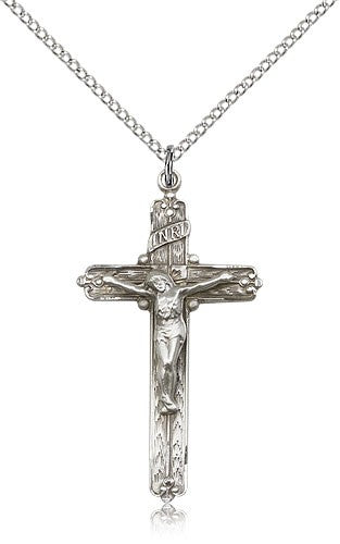 This Crucifix Pendant is paired with an 18 inch sterling silver lite curb chain as pictured. All medals are gift boxed in a light blue velvet jewelry box ready for gift giving.