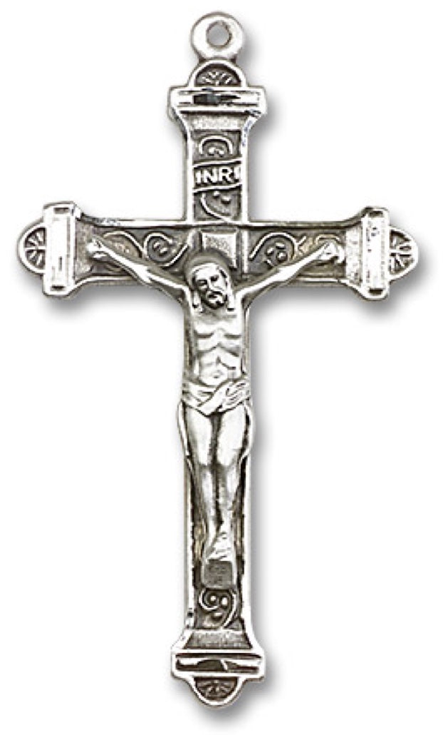 Wonderful masculine crucifix pendant with antique silver background accents and unique cross tip design.