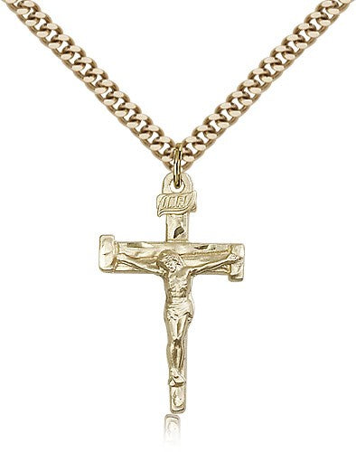 This Nail Crucifix Pendant is paired with an 18" gold filled light curb chain as pictured. All medals are gift boxed in a light blue velvet gift box ready for gift giving.