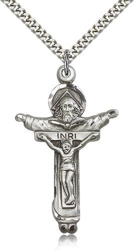 This Trinity Crucifix Pendant is paired with a 24 inch stainless steel heavy curb chain as pictured. All medals are gift boxed in a light blue velvet jewelry box ready for gift giving.