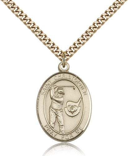 St. Christopher Golf Medal This St. Christopher Golf Pendant is made of gold filled and is approximately the size of a quarter. The jewelry pendant is paired with a 24 inch gold filled heavy curb chain as pictured. All medals are gift boxed in a beautiful blue velvet hinged jewelry gift box.