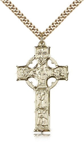 This Celtic Cross Pendant is paired with a 24 inch stainless steel gold-tone heavy curb chain as pictured. All medals are gift boxed in a light blue velvet jewelry box ready for gift giving.