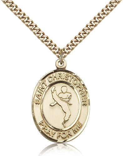 St. Christopher Martial Arts Medal This St. Christopher Martial Arts Pendant is made of gold filled and is approximately the size of a quarter. The jewelry pendant is paired with a 24 inch gold filled heavy curb chain as pictured. All medals are gift boxed in a beautiful blue velvet hinged jewelry gift box.