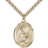 This Mater Dolorosa Pendant is made of gold filled and is approximately the size of a quarter. The jewelry pendant is paired with a 24 inch gold filled heavy curb chain as pictured. All medals are gift boxed in a beautiful blue velvet hinged jewelry gift box.