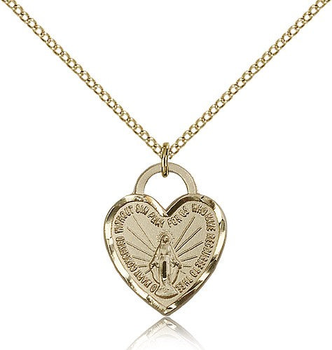 This Miraculous Heart Medal is paired with an 18" gold filled light curb chain as pictured. All medals are gift boxed in a light blue velvet gift box ready for gift giving.