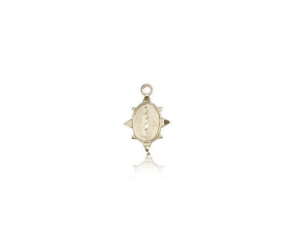 This Miraculous Medal is made of 14 Karat Gold. The jewelry pendant is sold as pictured and does not come with a chain. All medals are gift boxed in a light blue velvet jewelry box ready for gift giving.