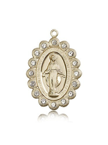This Miraculous Medal is made of 14 Karat Gold. The jewelry pendant is sold as pictured and does not come with a chain. All medals are gift boxed in a light blue velvet jewelry box ready for gift giving.