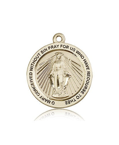 This Miraculous Medal is made of 14 Karat Gold. The jewelry pendant is sold as pictured and does not come with a chain. All medals are gift boxed in a light blue velvet jewelry box ready for gift giving.