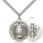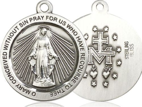 This Miraculous Medal is paired with a 24 inch stainless steel heavy curb chain as pictured. All medals are gift boxed in a light blue velvet jewelry box ready for gift giving.