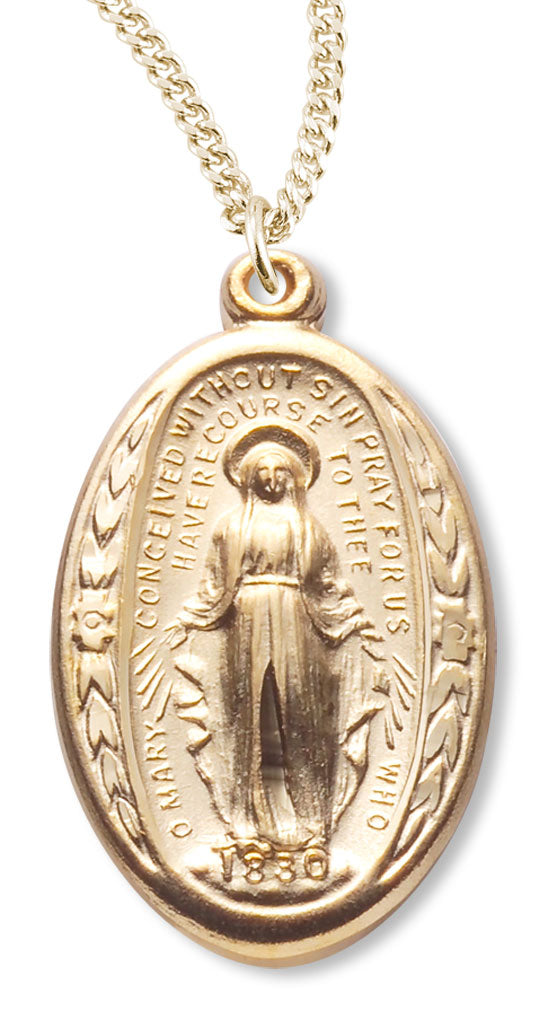 Women's 14kt Gold Over Sterling Silver Oval & Leaf Border Miraculous Necklace + 18 Inch Gold Plated Chain & Clasp