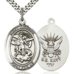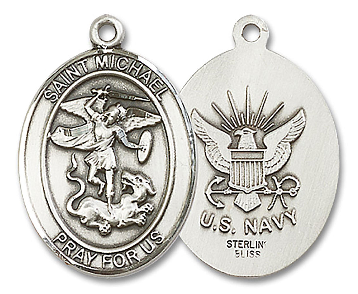 This St. Michael Navy Pendant is made of sterling silver and is approximately the size of a quarter.