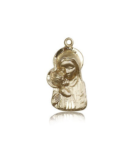 This Madonna and Child Medal is made of 14 Karat Gold. The jewelry pendant is sold as pictured and does not come with a chain. All medals are gift boxed in a light blue velvet jewelry box ready for gift giving.